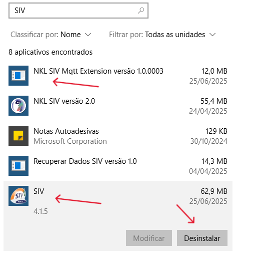 Clique em Desinstalar nas opções: “SIV” e “NKL SIV Mqtt Extension“.